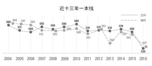 我省2016年本科一批分數(shù)線為文科530分、理科537分,與去年相比,分別降低38分、25分,也創(chuàng)造了2004年來歷屆高考的低分數(shù)線。