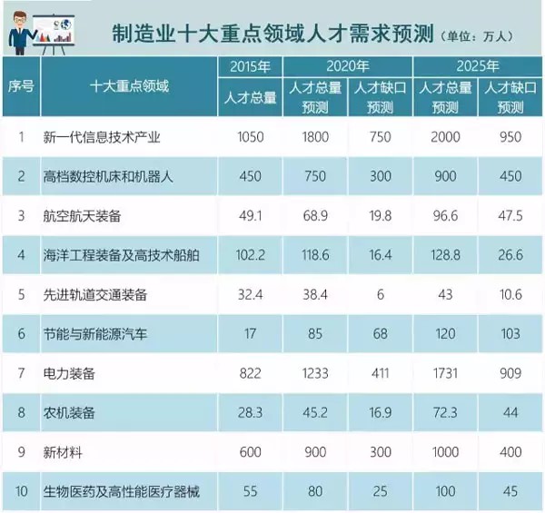 目前,技能人才數(shù)量基本滿足,但還存在重點(diǎn)領(lǐng)域高技能人才缺乏的結(jié)構(gòu)性矛盾。本次《指南》對(duì)制造業(yè)十大重點(diǎn)領(lǐng)域人才需求進(jìn)行了預(yù)測(cè):至2025年,新一代信息技術(shù)產(chǎn)業(yè)人才缺口將達(dá)950萬(wàn)人,高檔數(shù)控機(jī)床和機(jī)器人領(lǐng)域人才缺口將達(dá)450萬(wàn)人。(見(jiàn)下圖)