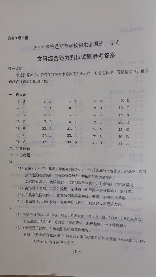 2017年山東高考文綜試題參考答案發(fā)布