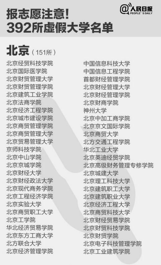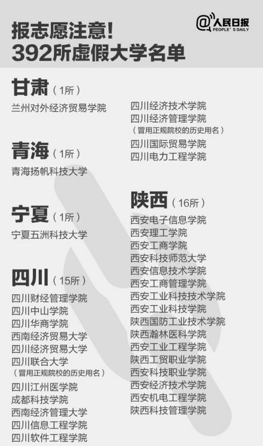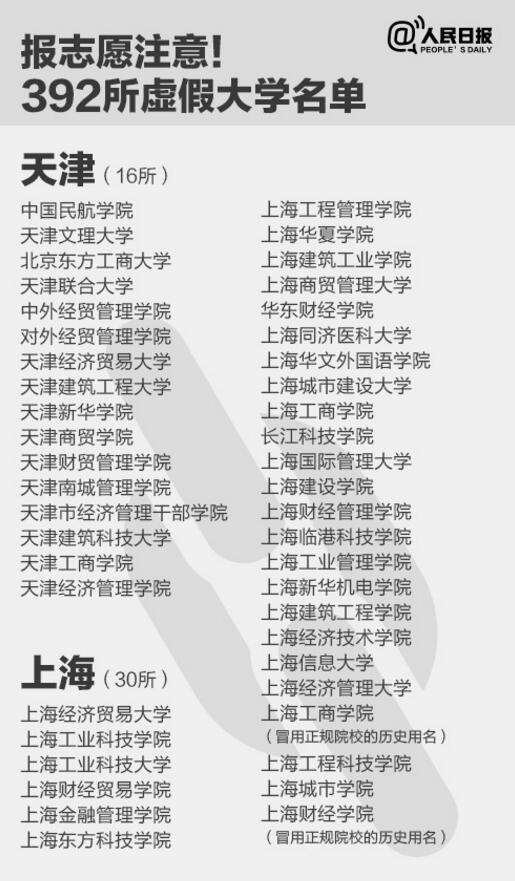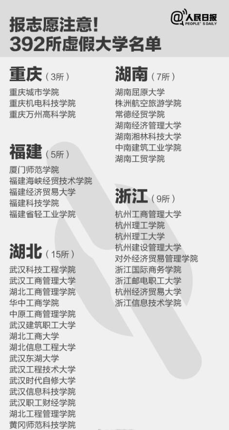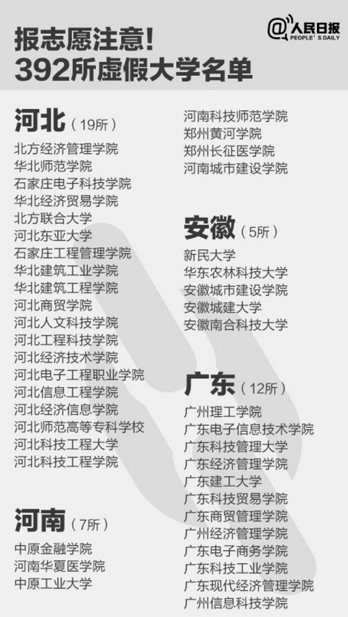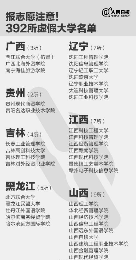 野雞大學就是虛假大學,沒有辦學資質(zhì),連文憑也是假的,F(xiàn)在各地高考成績正在陸續(xù)公布,學生們正在忙著填報志愿,而這種大學對學生來說就是地雷,一定要避開!現(xiàn)在,全國總共搜羅出392所野雞大學,請大家往下看。