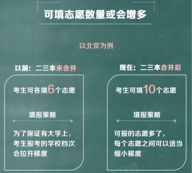 取消三本之后,對學生來說,直接的影響就是今年本二批次的分數(shù)線會降低。學生選擇余地更大,機會也更多了,但考試志愿填報的難度加大。之前很多學生只需要填6個志愿即可,但是取消三本后,二三本合并需要填10個志愿。