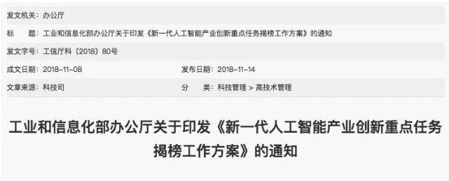 11月14日,工信部發(fā)布關(guān)于印發(fā)《新一代人工智能產(chǎn)業(yè)創(chuàng)新重點任務(wù)揭榜工作方案》的通知,啟動了人工智能產(chǎn)業(yè)創(chuàng)新重點任務(wù)揭榜工作,以下稱“人工智能揭榜工作”。