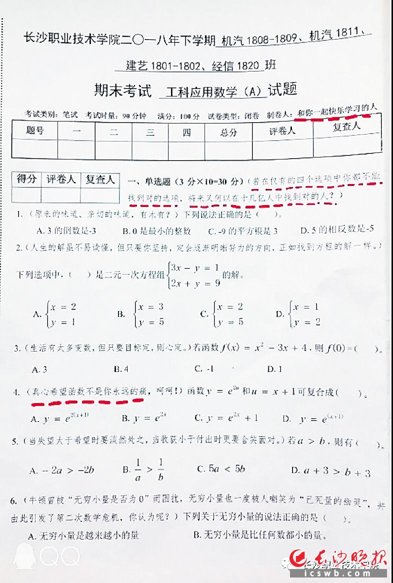 期末考試期間,長沙職業(yè)技術(shù)學院的朋友圈被一套“數(shù)學試卷”給刷屏,不少小伙伴在底下紛紛留言:“數(shù)學是我心中過不去的坎啊!”“我的數(shù)學真的不是語文老師教的!”“我怎么沒有遇見這樣的數(shù)學老師呢!”……那到底是一位什么樣的老師,出的一套什么樣的試卷,竟引來如此熱議?