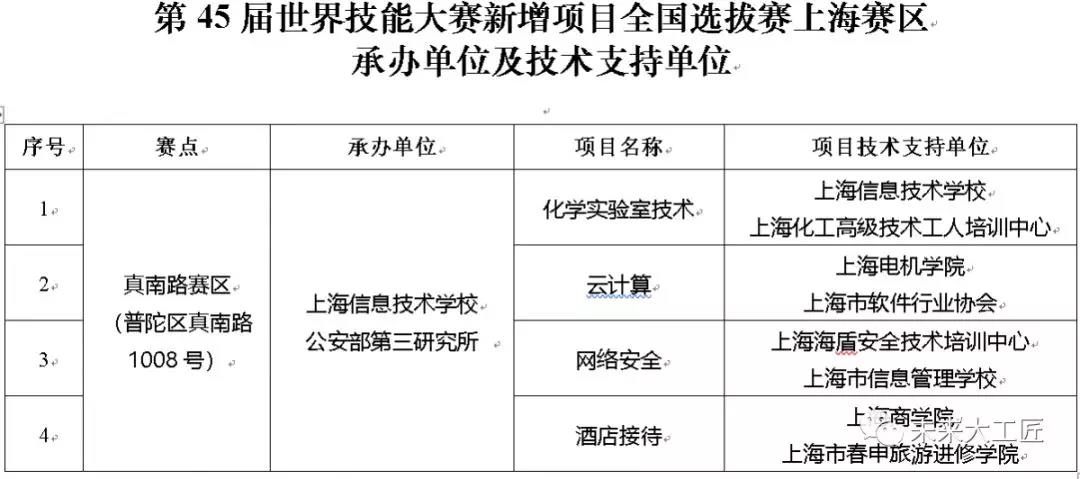 第45屆世界技能大賽新增項(xiàng)目全國(guó)選拔賽上海賽區(qū)組委會(huì)(以下簡(jiǎn)稱賽區(qū)組委會(huì))由上海市人力資源社會(huì)保障局牽頭成立,負(fù)責(zé)本賽區(qū)相關(guān)組織實(shí)施工作(名單見附件1)。