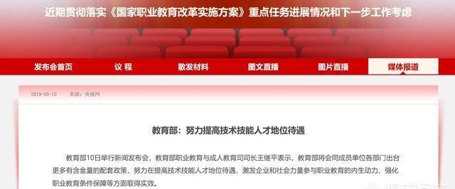 另外教育部職業(yè)教育與成人教育司司長表示,教育部將會同各部門出臺更多的有含金量的配套政策,目的在于“增加技術(shù)技能人才地位待遇、激發(fā)企業(yè)和社會力量參與職業(yè)教育的內(nèi)生動力、強(qiáng)化職業(yè)教育條件保障等方面取得實效”。