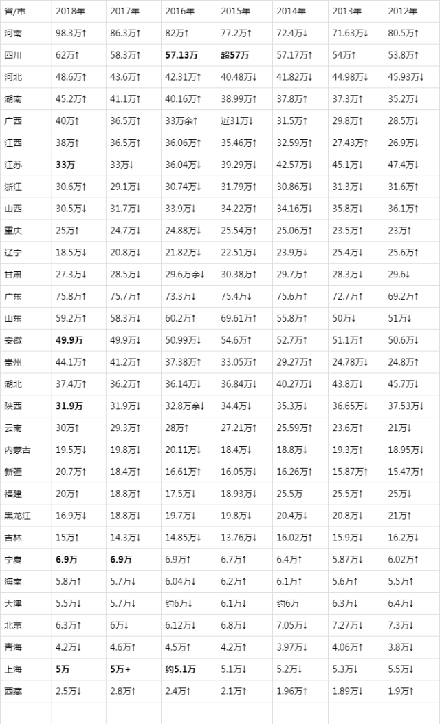 下面再看看2018及歷年各省市高考報(bào)名人數(shù)