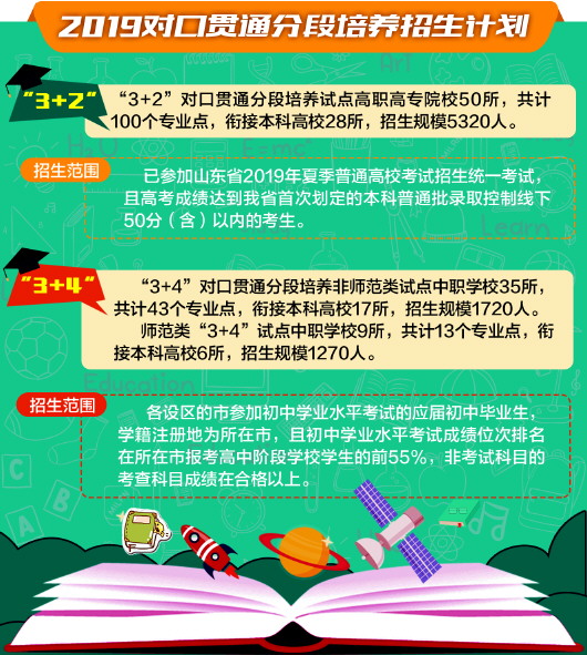 “3+2”貫通培養(yǎng)高職階段招生范圍為已參加山東省2019年夏季普通高?荚囌猩y(tǒng)一考試,且高考成績達到我省首次劃定的本科普通批錄取控制線下50分(含)以內(nèi)的考生?忌浫∮墒〗逃猩荚囋航y(tǒng)一組織,考生在?(高職)普通批按文史類或理工類填報志愿,由高職院校根據(jù)高考錄取規(guī)則錄取并辦理錄取手續(xù)。
