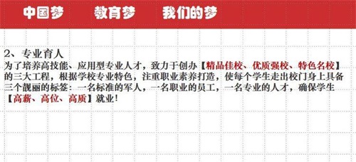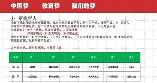陽(yáng)谷軍校職教中心以貫徹特色辦學(xué)方針,本著以學(xué)生為中心,一切工作圍繞學(xué)生的原則,零起點(diǎn)學(xué)習(xí),分層次教學(xué),效仿軍隊(duì)正規(guī)化管理,繼承軍隊(duì)優(yōu)良傳統(tǒng)“以素質(zhì)為基礎(chǔ),能力為核心,技能為重點(diǎn)”形成以學(xué)生能力為導(dǎo)向,職業(yè)教育為依托,升學(xué)、參軍、學(xué)技術(shù)、就業(yè)為目的。按照上學(xué)即當(dāng)兵、課堂即職場(chǎng)、實(shí)踐即上崗的辦學(xué)思路,形成準(zhǔn)軍事化管理,秉承傳統(tǒng)文化教育與學(xué)生自主管理相結(jié)合,辦學(xué)特色突出,寬進(jìn)嚴(yán)出,就業(yè)有優(yōu)勢(shì),創(chuàng)業(yè)有本領(lǐng),升學(xué)有希望,發(fā)展有基礎(chǔ),目前學(xué)校已成為山東省優(yōu)質(zhì)特色學(xué)校。