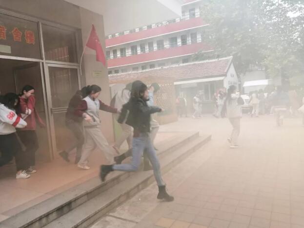 下午4時,隨著警報聲的響起,學(xué)校應(yīng)急疏散演練總指揮下達(dá)了“學(xué)校公寓樓發(fā)生火災(zāi),請同學(xué)們立即撤離”的命令,緊接著,每層樓兩側(cè)的負(fù)責(zé)人迅速組織學(xué)生疏散,學(xué)生們在老師的指揮下,彎著腰,用手帕、毛巾等捂住口鼻,沿著學(xué)校制定的路線快速撤離,有序撤離到學(xué)校操場的安全地帶。之后各班班主任清點人數(shù),并層層上報,全校師生安全到達(dá)操場。