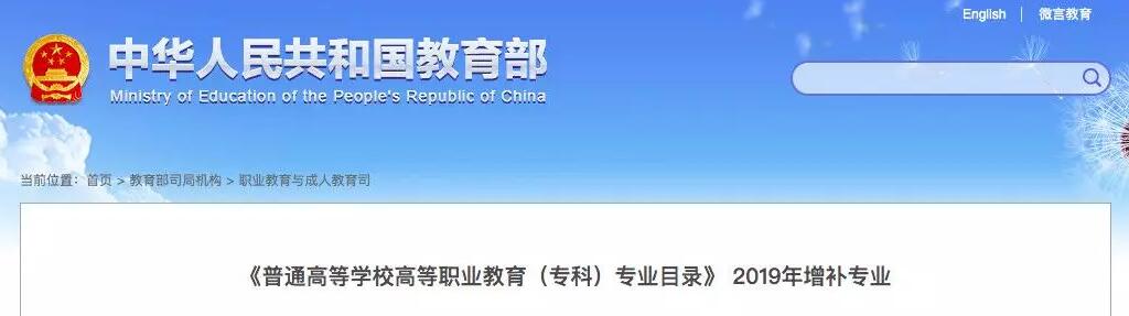 根據(jù)《普通高等學(xué)校高等職業(yè)教育(專(zhuān)科)專(zhuān)業(yè)設(shè)置管理辦法》,在相關(guān)學(xué)校和行業(yè)提交增補(bǔ)專(zhuān)業(yè)建議的基礎(chǔ)上,教育部組織研究確定了2019年度增補(bǔ)專(zhuān)業(yè)共9個(gè),現(xiàn)予公布,自2020年起執(zhí)行。