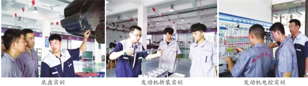 設有一體化教室2個、模擬實訓室1個、發(fā)動機一體化教學實訓室4個、底盤一體化教學實訓室3個、電氣控制一體化教學實訓室2個、四輪定位教學實訓區(qū)、汽車故障檢測教學實訓區(qū)、汽車美容教學實訓區(qū)、汽車 整形噴漆教學實訓區(qū)、汽車二級保養(yǎng)教學實訓區(qū)、新能源教學實訓區(qū)。大型實訓設備200余臺套。采用一體化 教學模式,結(jié)合具體的維修工作任務,以工作過程為導向、以工作項目為載體,進行模塊化實訓,實施過程化評價。