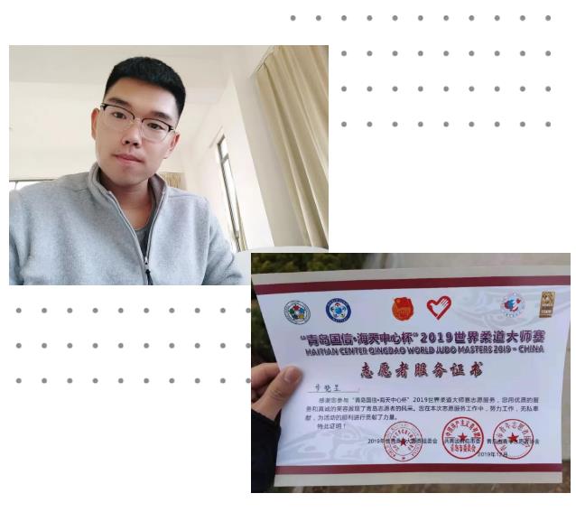 在大學(xué)期間,我在班級中擔(dān)任團(tuán)支書一職,對待工作能夠認(rèn)真負(fù)責(zé);在開學(xué)初積極遞交了入黨申請書;現(xiàn)任青島理工大學(xué)琴島學(xué)院青年志愿者聯(lián)合會干事,并獲得“優(yōu)秀干事”稱號;在2019年12月,通過學(xué)院面試選拔,參加“2019世界柔道大師賽”的志愿服務(wù)工作,并獲榮譽(yù)證書。