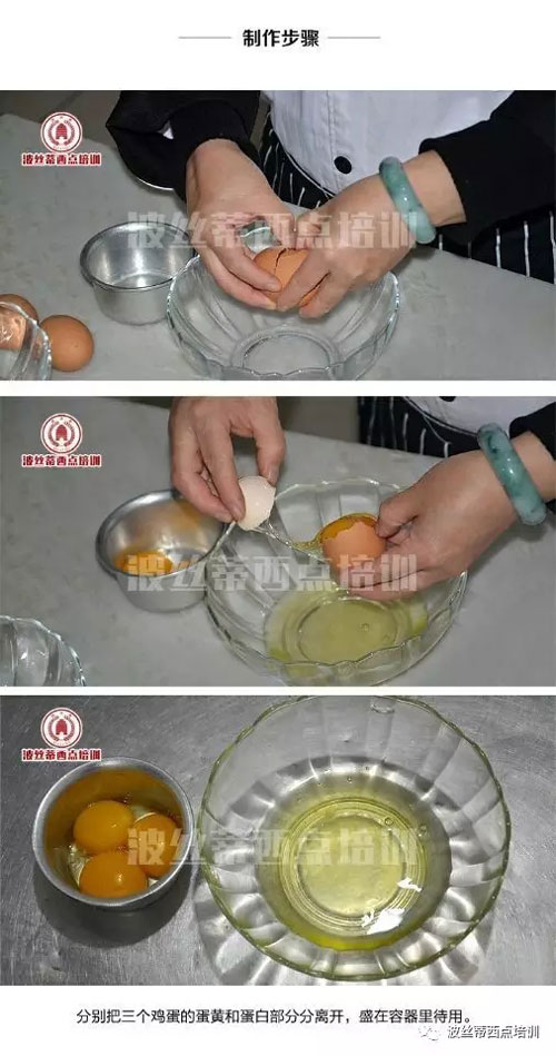 分蛋要點:盛蛋黃和蛋白的器皿要無油,無水,蛋白中不能有蛋黃,如果天氣比較熱時,可以放在冰箱中冷藏一下,比較好分,如果做的量比較大可以用分蛋器。
