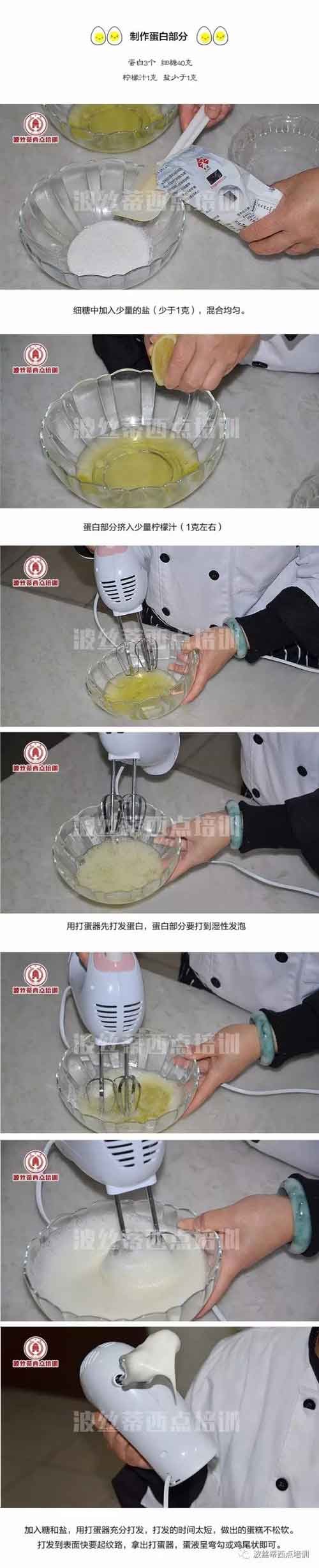 #蛋白要打到八成硬性即可,表面光滑,打得不夠,蛋糕起發(fā)不好,打得過了,蛋糕吃起來會粗糙。
