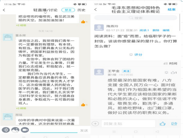 為了保證線上教學(xué)的正常開展,思政部組織教師利用假期時間集體備課,調(diào)試平臺和設(shè)備,分專題分任務(wù)提前一周將課件、教案、視頻、案例等教學(xué)資源上傳到教學(xué)平臺。通過學(xué)習(xí)強國平臺召開線上教學(xué)調(diào)度會,集中解決上課中遇到的問題,借助超星、得實、藍墨、QQ、微信等平臺,發(fā)布學(xué)習(xí)任務(wù)單,觀看直播或講課視頻,組織學(xué)生討論,完成自測題和線上作業(yè),通過線上簽到和學(xué)習(xí)積分統(tǒng)計進行平時考核。