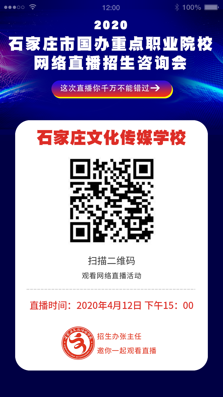 為幫助2020屆初三學(xué)子們了解到職業(yè)院校權(quán)威招考資訊,職教網(wǎng)聯(lián)合多所國辦重點(diǎn)職業(yè)院校共同舉辦的"2020年石家莊市國辦重點(diǎn)職業(yè)院校網(wǎng)絡(luò)直播招生咨詢會"公益直播活動,第一場將于4月12日下午15:00舉行。活動邀請首批四所國辦學(xué)校的招生辦負(fù)責(zé)人以直播形式,為學(xué)生答疑解惑!
