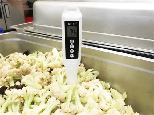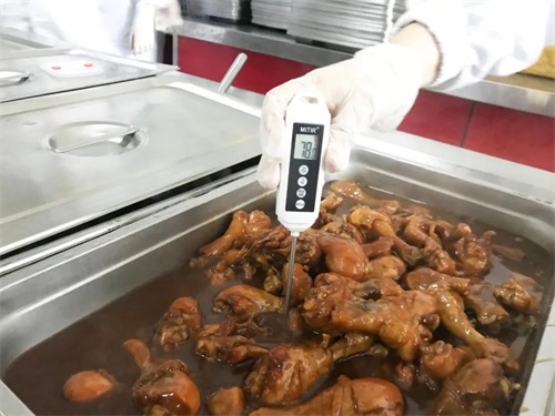 菜炒熟后,進行中心溫度測量,確保食材的熟度、溫度,并取樣留存。