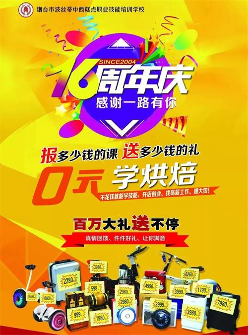 煙臺市波絲蒂中西糕點職業(yè)技能培訓(xùn)學(xué)校創(chuàng)立于2004年,是中西糕點專業(yè)培訓(xùn)機(jī)構(gòu),是煙臺市人力資源和社會保障局指定的正規(guī)技能培訓(xùn)基地。西點課程設(shè)置全面:面包專科班、蛋糕?瓢、休閑干點班、月餅?瓢、披薩?瓢、裱花專科班、法式甜品?瓢、韓式裱花班、休閑飲品咖啡班、健康日式面包提升班、私房創(chuàng)業(yè)綜合班、業(yè)余西點流行班等等。
