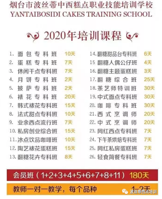 煙臺市波絲蒂中西糕點(diǎn)職業(yè)技能培訓(xùn)學(xué)校創(chuàng)立于2004年,是中西糕點(diǎn)專業(yè)培訓(xùn)機(jī)構(gòu),是煙臺市人力資源和社會保障局指定的正規(guī)技能培訓(xùn)基地。西點(diǎn)課程設(shè)置全面:面包專科班、蛋糕?瓢、休閑干點(diǎn)班、月餅?瓢、披薩?瓢、裱花?瓢、法式甜品?瓢、韓式裱花班、休閑飲品咖啡班、健康日式面包提升班、私房創(chuàng)業(yè)綜合班、業(yè)余西點(diǎn)流行班等等。