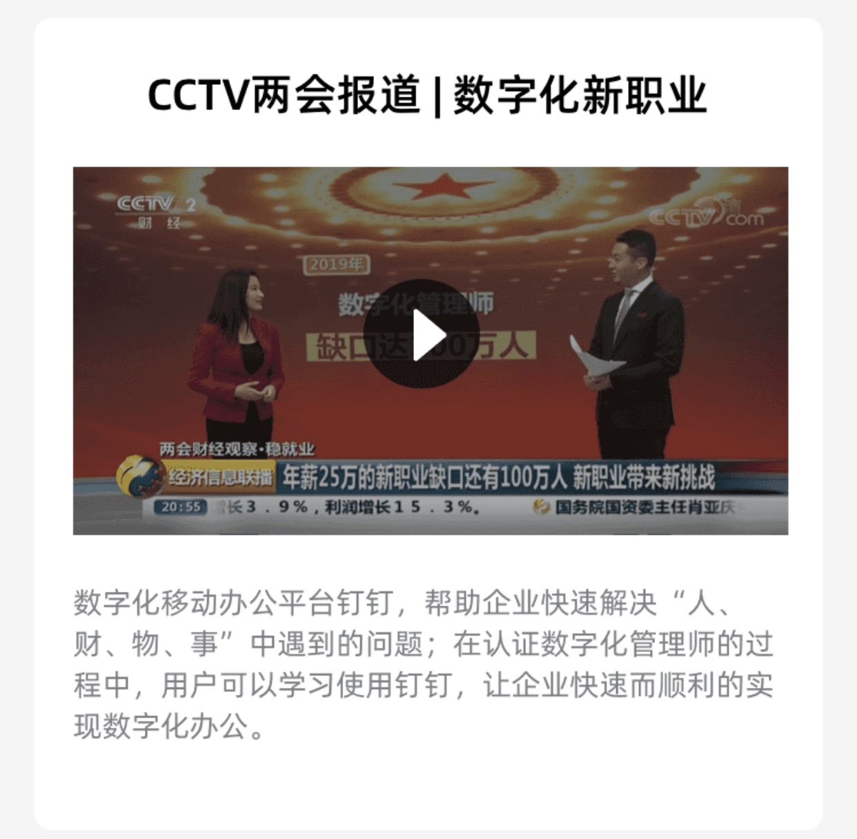 企業(yè)數(shù)字化轉(zhuǎn)型就是利用數(shù)字化技術(shù)(如大數(shù)據(jù)、云計(jì)算、人工智能等)來(lái)推動(dòng)企業(yè)組織轉(zhuǎn)變業(yè)務(wù)模式,組織架構(gòu),企業(yè)文化等的變革措施。在這一背景下,釘釘開(kāi)始迅速普及也帶來(lái)了企業(yè)的升級(jí),帶來(lái)了企業(yè)架構(gòu)的轉(zhuǎn)變。其中就衍生出來(lái)了一個(gè)新職業(yè)——數(shù)字化管理師。2019年1月,人社部公布了十五個(gè)擬發(fā)布的新職業(yè),數(shù)字化管理師就身在其中。