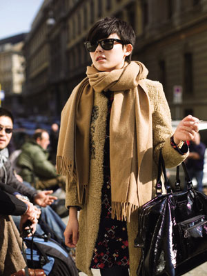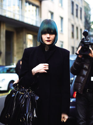 如此冷艷的發(fā)色,不論走到哪里都是路人注目的焦點。金屬色手袋為全身增添時尚氣氛。