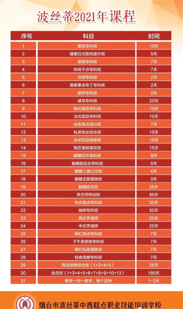 波絲蒂西點培訓學校創(chuàng)立于2004年,是中西糕點專業(yè)培訓機構,是煙臺市人力資源和社會保障局指定的正規(guī)技能培訓基地;大學生及再就業(yè)人員職業(yè)技能培訓基地;煙臺市金藍領高技能人才培訓基地。西點課程設置全面:面包?瓢、蛋糕專科班、休閑干點班、月餅?瓢、披薩?瓢、裱花專科班、法式甜品專科班、韓式裱花班、休閑飲品咖啡班、健康日式面包提升班、私房創(chuàng)業(yè)綜合班、業(yè)余西點流行班等等。