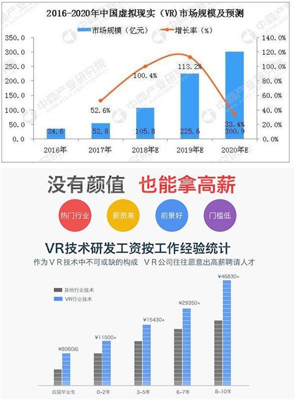 國家工信部《2017中國VR產(chǎn)業(yè)投融資白皮書》數(shù)據(jù),預(yù)計到2020年虛擬現(xiàn)實市場進入相對成熟期,產(chǎn)業(yè)規(guī)模將達到918.2億元,現(xiàn)階段中國虛擬現(xiàn)實人才數(shù)量僅占全球2%,但對虛擬實現(xiàn)人才 的需求卻達18%,虛擬現(xiàn)實產(chǎn)業(yè)前景廣闊,人才需求量大,實現(xiàn)高薪就業(yè)夢想。