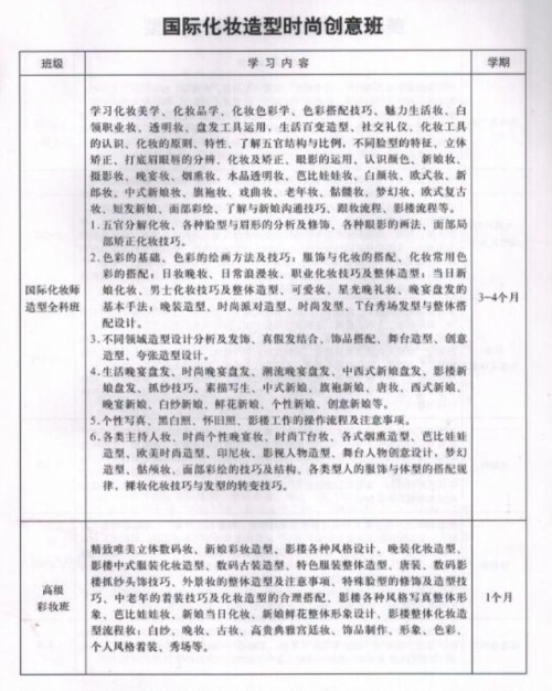 開設(shè)課程有:美發(fā)時尚修剪、精剪班;沙龍商業(yè)時尚燙染班;高級美容班;美甲時尚創(chuàng)意班;美睫美瞳班;個人形象設(shè)計班;國際美發(fā)時尚創(chuàng)意班;時尚百變造型班;高級彩妝班;國際化妝師造型全科班;攝影全科班;社交禮儀班;營銷管理等。