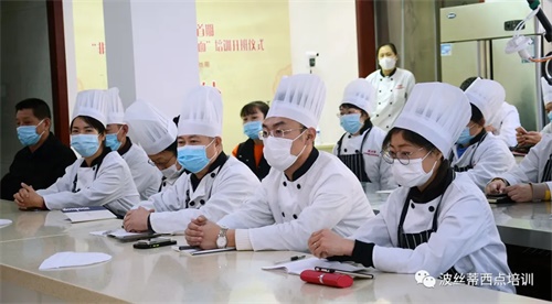 煙臺市芝罘區(qū)公共就業(yè)和人才服務(wù)中心王滋軍副主任(左三)、煙臺市芝罘區(qū)公共就業(yè)和人才服務(wù)中心培訓(xùn)科邢海英科長(右三)、蓬萊小面?zhèn)鞒腥送醺5摚ㄗ蠖,中飯協(xié)膠東促進委研究院秘書長王惠忠(右二),煙臺市波絲蒂中西糕點職業(yè)技能培訓(xùn)學(xué)校校長陳紅林(左一)共同出席了開班儀式。