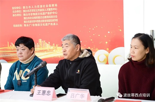 中飯協(xié)膠東促進(jìn)委研究院秘書長(zhǎng)王惠忠教授致詞:今天的煙臺(tái)面塑已是煙臺(tái)地域文化的活化石,具有深厚的文化價(jià)值、歷史價(jià)值和實(shí)用價(jià)值。當(dāng)前,國(guó)家非常重視非物質(zhì)文化遺產(chǎn)的保護(hù)與傳承,把非物質(zhì)文化遺產(chǎn)轉(zhuǎn)為課程,為大家提供免費(fèi)學(xué)習(xí)的機(jī)會(huì),希望通過大家的學(xué)習(xí)傳播,共同把煙臺(tái)面塑技藝發(fā)揚(yáng)光大。