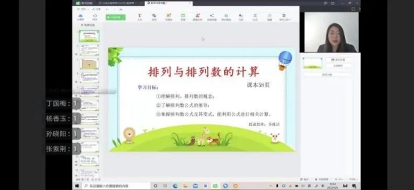 李雅潔老師提前將《排列與排列數(shù)》的學(xué)案、電子課本等資源分享給學(xué)生預(yù)習(xí);利用希沃平臺(tái)課件輔助教學(xué),自創(chuàng)問題情境導(dǎo)入新授知識(shí)點(diǎn),配以視頻輔助教學(xué);利用互動(dòng)面板,讓學(xué)生以回復(fù)數(shù)字或簡(jiǎn)單語言的方式回答問題,進(jìn)行師生互動(dòng);典型例題使用在線手寫板演示,使解答步驟更清晰。