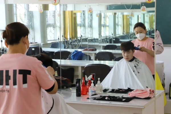在上好課以及管理好班級(jí)的同時(shí),李立華老師也發(fā)揮著自己的專業(yè)特長(zhǎng),在做好防護(hù)的基礎(chǔ)上按照有關(guān)疫情防控的要求,與同專業(yè)兩位教師一起去到學(xué)校為因疫情封閉在校內(nèi)的80余名師生剪頭發(fā)。在剪發(fā)開始前李立華老師將剪刀、梳子等理發(fā)工具進(jìn)行消毒,為每一位需要理發(fā)的師生認(rèn)真的修剪,每剪一個(gè),還不忘用酒精對(duì)理發(fā)工具進(jìn)行消毒,讓師生們感到安心。細(xì)致周到的服務(wù),讓留校的師生們倍感溫暖。