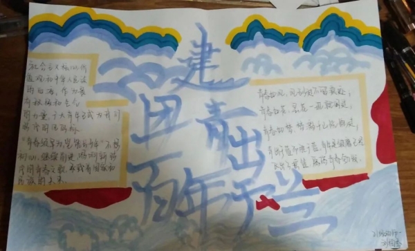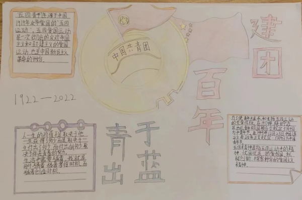 1922年5月5日至5月10日,中國社會主義青年團(tuán)第一次全國代表大會在廣州東園隆重舉行。在中國共產(chǎn)黨直接領(lǐng)導(dǎo)下,中國共產(chǎn)主義青年團(tuán)成立。由此,中國青年團(tuán)組織正式誕生了,這是中國青年運動發(fā)展史上的一個里程碑。習(xí)主席曾寄語青年:“對想做、愛做的事要敢試敢為,努力從無到有、從小到大,把理想變?yōu)楝F(xiàn)實。要敢于做先鋒,而不做過客、當(dāng)看客,讓創(chuàng)新成為青春遠(yuǎn)航的動力,讓創(chuàng)業(yè)成為青春搏擊的能量,讓青春年華在為國家、為人民的奉獻(xiàn)中煥發(fā)出絢麗光彩!闭^,長江后浪推前浪,一代更比一代強(qiáng)。100年櫛風(fēng)沐雨,共青團(tuán)始終堅定不移跟黨走,團(tuán)結(jié)帶領(lǐng)共青團(tuán)員和廣大青年前赴后繼、勇當(dāng)先鋒,書寫了中國青年運動的華章。在中國共青團(tuán)成立100周年之際,為迎接黨的二十大勝利召開,大力弘揚和培育以愛國主義為核心的民族精神,團(tuán)結(jié)引領(lǐng)廣大團(tuán)員青年建功新時代、奮進(jìn)新征程,提升團(tuán)員青年的歷史責(zé)任感和使命感,臨沂沂蒙職業(yè)中等專業(yè)學(xué)校團(tuán)委面向?qū)W校全體共青團(tuán)員組織開展了慶祝中國共產(chǎn)主義青年團(tuán)成立100周年主題繪畫(手抄報)活動,得到青年團(tuán)員的熱烈響應(yīng)。