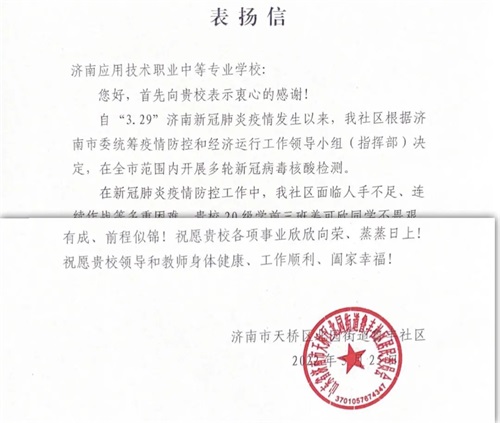 當(dāng)疫情形勢(shì)穩(wěn)定濟(jì)南應(yīng)用技術(shù)職業(yè)中等專業(yè)學(xué)校復(fù)學(xué)后,其中3名同學(xué)在防疫志愿工作中的優(yōu)異表現(xiàn)得到了當(dāng)?shù)亟值谰游瘯?huì)的認(rèn)可,向?qū)W校發(fā)來(lái)了表?yè)P(yáng)信與榮譽(yù)證書,請(qǐng)大家為這6名防疫志愿者點(diǎn)贊。