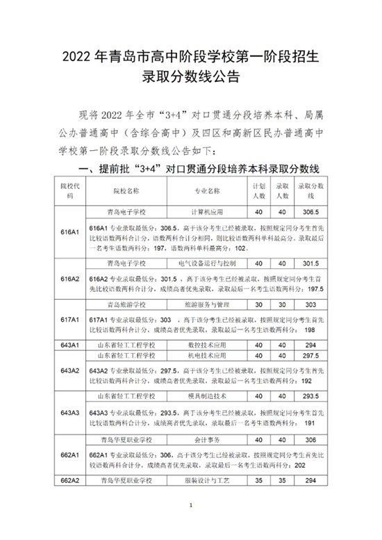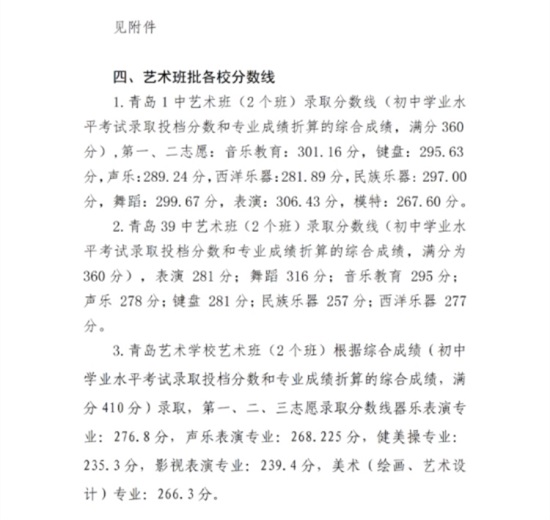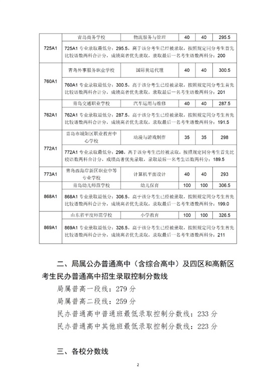 目前青島市市教育局已完成3+4本科提前批、膠州四中航空班、局屬普通高中自招批、特長批、藝術(shù)班批和普通批的錄取。主要分?jǐn)?shù)線情況如下: