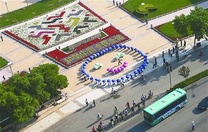 圖為用雨傘組成的卡通笑臉“綻放”在泉城廣場(chǎng)。