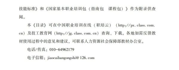本《目錄》可在中國職業(yè)培訓(xùn)在線(職培云) (http:/ / px. class. com.cn) 及技工教育網(wǎng)(http:/ / jg. class. com. cn) 查詢、下載。各地如需反饋教材使用過程中的意見和建議, 可聯(lián)系人力資源社會保障部教材辦公室。