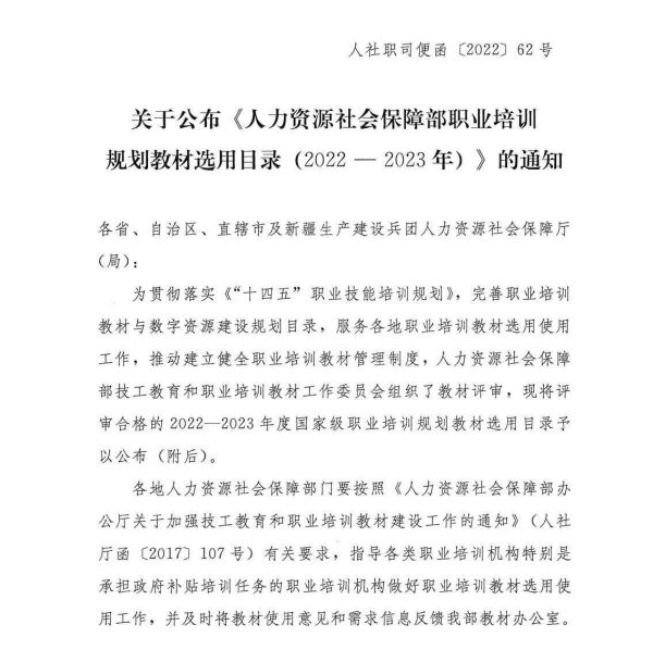 山東技校網(wǎng) >> 菁菁校園 >> 《人力資源社會保障部職業(yè)培訓(xùn)規(guī)劃教材選用目錄(2023年)》發(fā)布