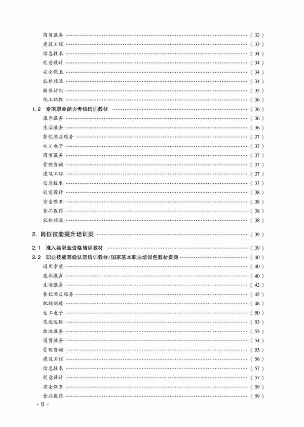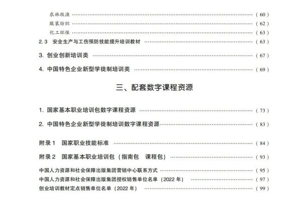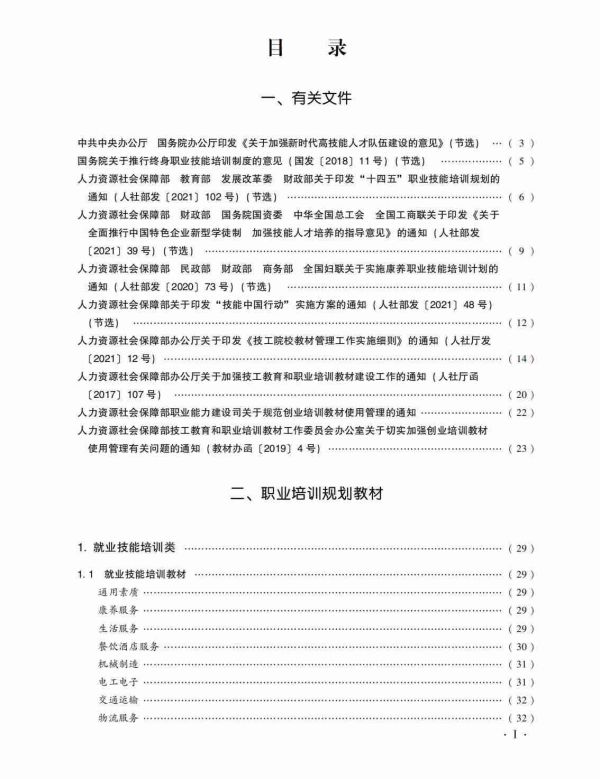 《目錄》中就業(yè)技能培訓(xùn)類、崗位技能提升培訓(xùn)類教材按通用素質(zhì)、康養(yǎng)服務(wù)、生活服務(wù)、機械制造、電工電子、交通運輸、商貿(mào)服務(wù)等職業(yè)類別分別排序, 每一職業(yè)類別中按漢語拼音順序排序。已正式出版的《國家職業(yè)技能標準》和《國家基本職業(yè)培訓(xùn)包(指南包 課程包) 》作為附錄供查閱。