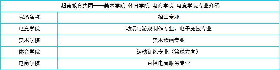 超競教育集團(tuán)開設(shè)了什么專業(yè)?超競教育集團(tuán)下設(shè)美術(shù)學(xué)院、體育學(xué)院、電商學(xué)院、電競學(xué)院,各個(gè)學(xué)院也開設(shè)了相關(guān)的專業(yè)課程,超競教育集團(tuán)以精細(xì)的管理、精心的服務(wù)、精良的方式創(chuàng)造精品的教育服務(wù)取得了大家的信賴,那么下面,同學(xué)們可以一起來了解一下該校的專業(yè)設(shè)置情況。