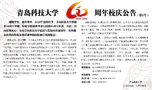 齊魯瑰寶青島城,三面臨海一陸通,碧海藍(lán)天白鷗飛,紅瓦綠樹彩畫屏,桃李盈門賀華誕,芝蘭滿室議前程。值此建校59周年之際,青島科技大學(xué)業(yè)已啟動60周年校慶籌備工作(正式慶典活動將于2010年9月隆重舉行),內(nèi)容包括:文物征集、建館修史、學(xué)術(shù)論壇、宣傳慶典、文藝演出、成果展示、校園建設(shè)、籌資發(fā)展等。一個(gè)人一份力量,一顆心一份熱忱。我們熱忱歡迎和衷心期待全體校友、校董、社會各界人士關(guān)心支持青島科技大學(xué)60周年校慶的各項(xiàng)籌備工作,與我們一道共襄盛典,同謀未來。