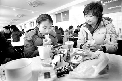 第一科語文考試后,家長帶著孩子來到休息室吃自帶的干糧 攝/記者黑克(記者韓旭)