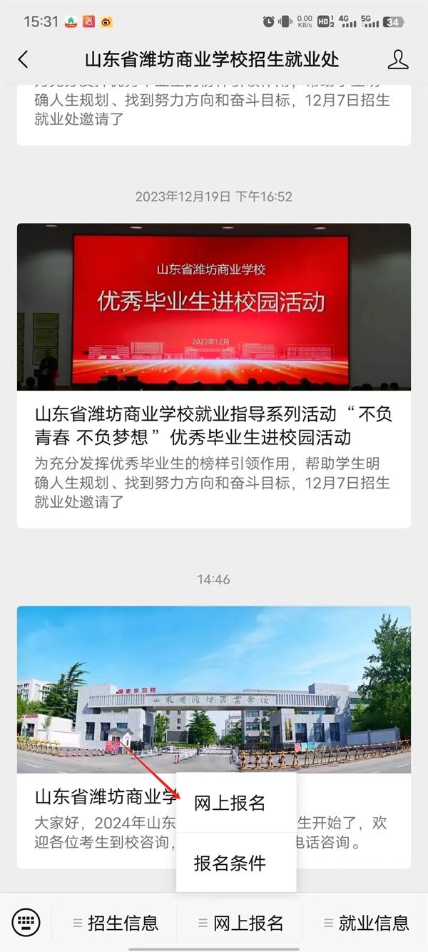有意向報名的考生可以通過我們招生就業(yè)處公眾號填報,現(xiàn)在報名的目的,是后期我們會根據(jù)考生所報的層次和專業(yè),在濰坊市教育局通知統(tǒng)一填報志愿時給予幫助指導(dǎo),考生報名自愿。所以考生均以教育局指定網(wǎng)站報志愿為準(zhǔn)!