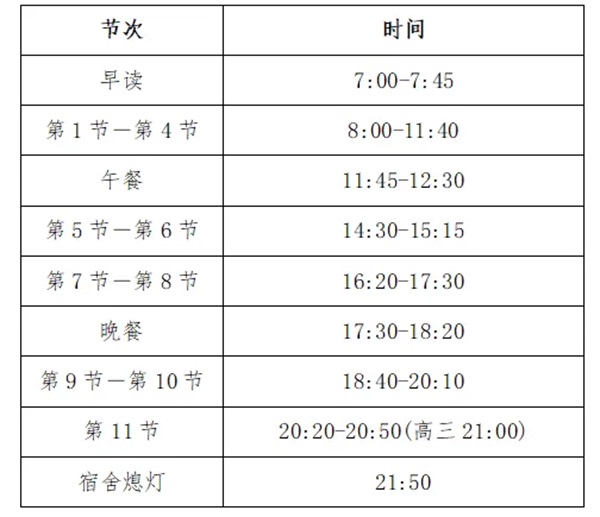 學(xué)生每周六上午離校,周日下午5點(diǎn)到校點(diǎn)名。周六不回家的學(xué)生學(xué)校老師會(huì)管理并檢查宿舍。高三學(xué)生兩周放假回家一次。