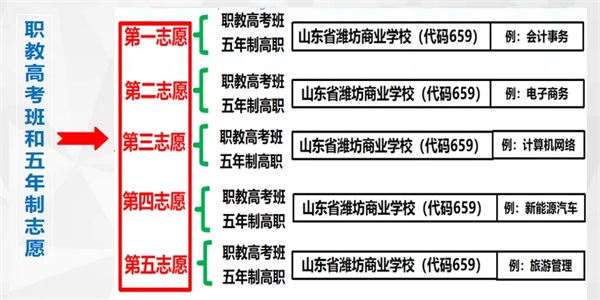 職教高考與夏季高考一樣,由山東省考試院統(tǒng)一組織命題、考試錄取,學(xué)生考入本科院校和?圃盒.厴I(yè)后均為國家認(rèn)可的第一學(xué)歷。山東省濰坊商業(yè)學(xué)校從2012年開始舉辦職教高考升學(xué)。