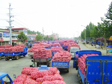 通往金鄉(xiāng)南店子市場的馬路已經(jīng)被運蒜車擠得水泄不通。