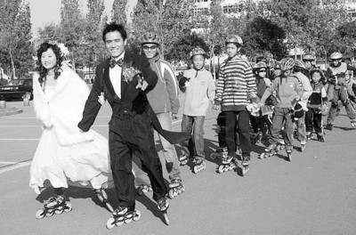 濟(jì)南一對(duì)新人舉行輪滑婚禮