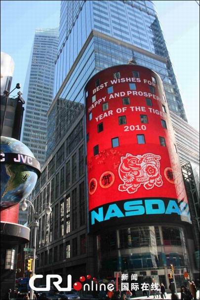 2010年春節(jié)期間,美國紐約時代廣場上,納斯達(dá)克總部大樓外的大屏幕打出了恭賀中國新春的圖案和中英文字樣。
