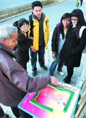背單詞枯燥自創(chuàng)英語麻將 老漢高校門前擺
