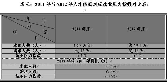 由表三可見,2012年求職人數(shù)及需求人數(shù)較2011年分別上漲了2.1%和7.4%,求職人數(shù)增幅不敵需求人數(shù),人才供大于求狀況得到緩解。今年就業(yè)壓力指數(shù)約為1.2,比去年下降7.7個百分點,求職者面臨的就業(yè)壓力有所減輕。